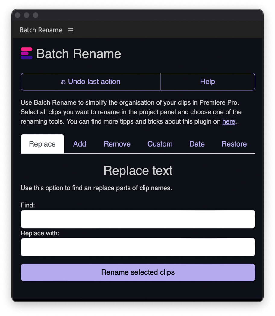 De Batch Rename plugin geeft je nieuwe mogelijkheden om de organisatie van je clips in Premiere Pro te vereenvoudigen. Selecteer je clips en gebruik de plugin om je clips sneller in batch te hernoemen. Vervang woorden in je bronbestanden of voeg datums en aangepaste tekst toe aan je clipnamen. De plugin biedt meer opties om grote Premiere Pro producties te optimaliseren. Geoptimaliseerd voor de behoeften van assistent-editors.