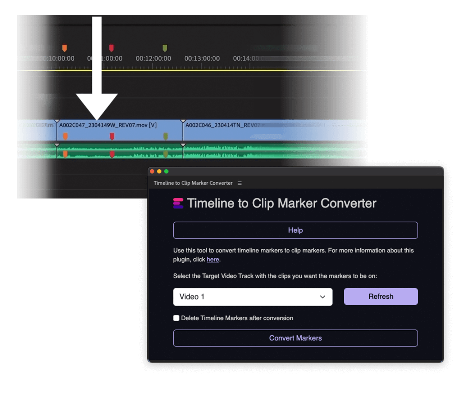 Met deze plugin kun je eenvoudig alle tijdlijnmarkeringen converteren naar clipmarkeringen. Je kunt ook de videolaag selecteren waar je ze wilt plaatsen en de tijdlijnmarkeringen automatisch verwijderen na de conversie. Gebruik deze plugin om alle tijdlijnmarkeringen op videoclips te plaatsen.