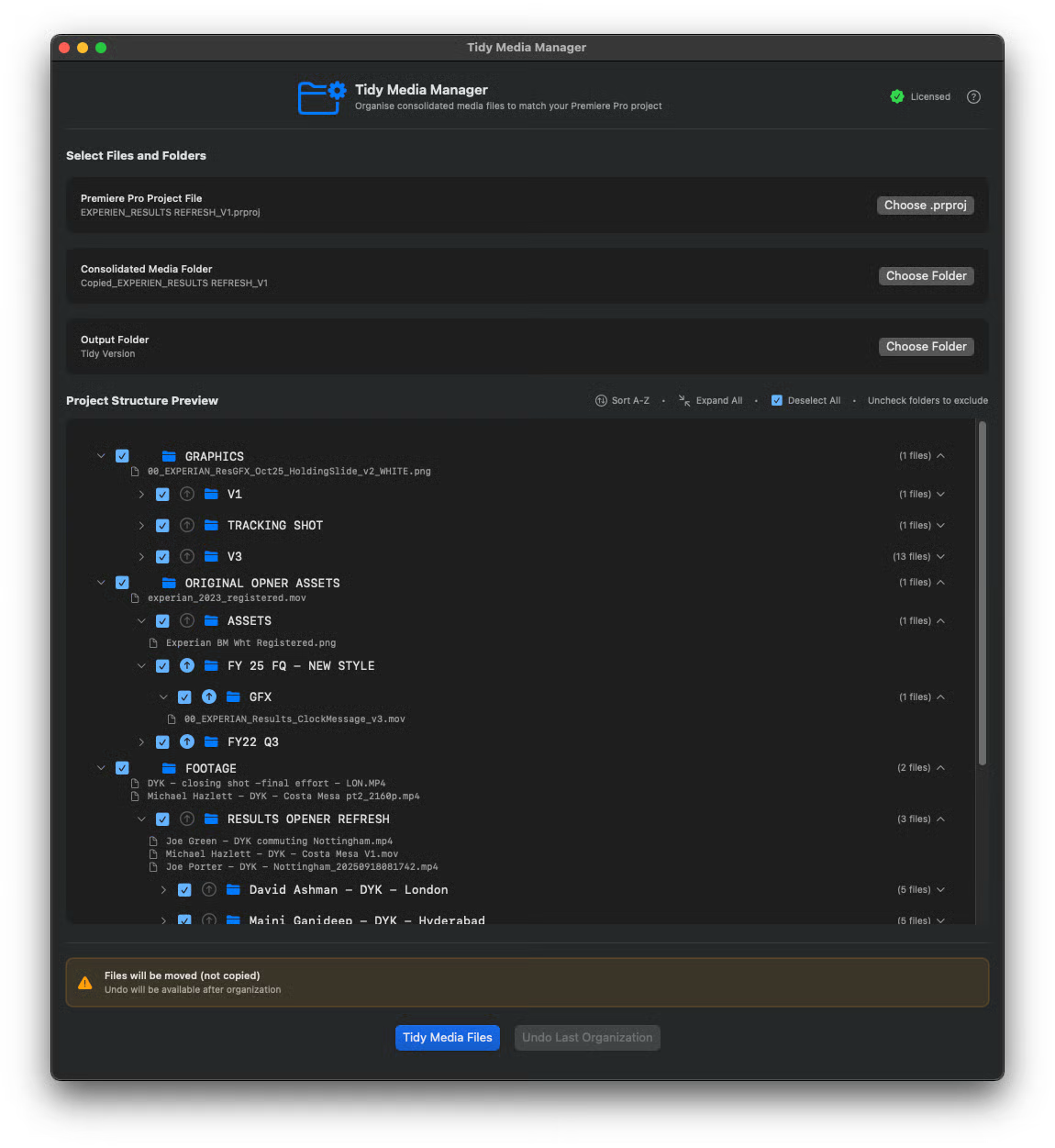 The original project file remains untouched. The app creates a "Tidied" copy, ensuring you always have a backup. If the result isn't what you expected, use the built-in Undo function.